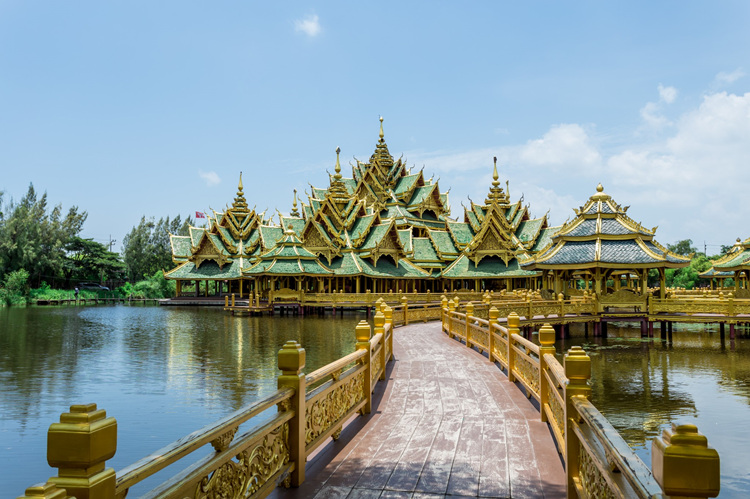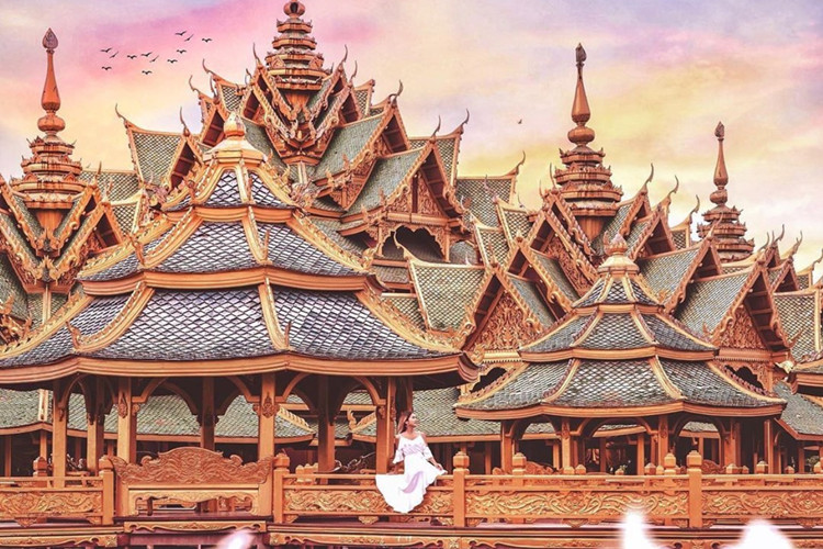 在您眼前的是罗汉殿,这是一座将泰国、缅甸和中国的建筑艺术风格完美的结合在一起的水中佛殿。佛殿的内部供奉着大乘佛教和小乘佛教中的罗汉雕像,它们与大乘佛教中的释迦牟尼佛一起成为罗汉殿中的主要雕像。在罗汉殿的前部,供奉着将会在下一次转世中来到人间成为佛祖的弥勒佛。这是我们古城创始人的最后一个作品,到现在也还在不断的雕琢完善。