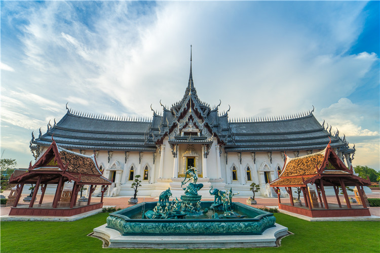 宝殿的内部分为三个部分,分别是:左殿、中殿和右殿,那走进殿内我们可以看到,整个宝殿的内顶是用纯金打造的,门窗是由珍珠母贝镶嵌。左殿就是以前国王上朝理政、处理国家事务的地方,现在里面还展示了当时贵族们穿戴的服装首饰;中殿呢,是以前国王礼佛的地方,里面供奉了一尊纯金的佛像,还有1972年拉玛9世国王和英国伊丽莎白女皇二世御驾亲临的照片也在这里展出;而右殿呢,是以前国王休息、处理后宫事务的地方,现在被用来展示古城创始人的个人收藏,通过这些藏品可以看到林国华先生对传统文化的重视,希望人们能够尊重历史,传承文化,不要让它们在历史的长河中沉没消失。