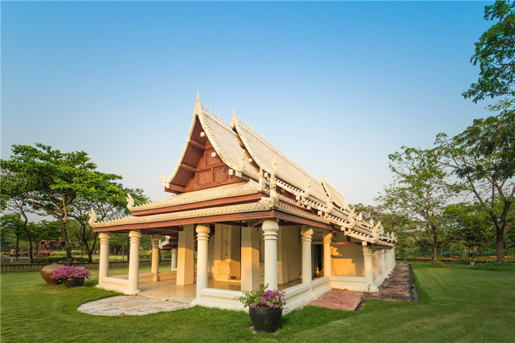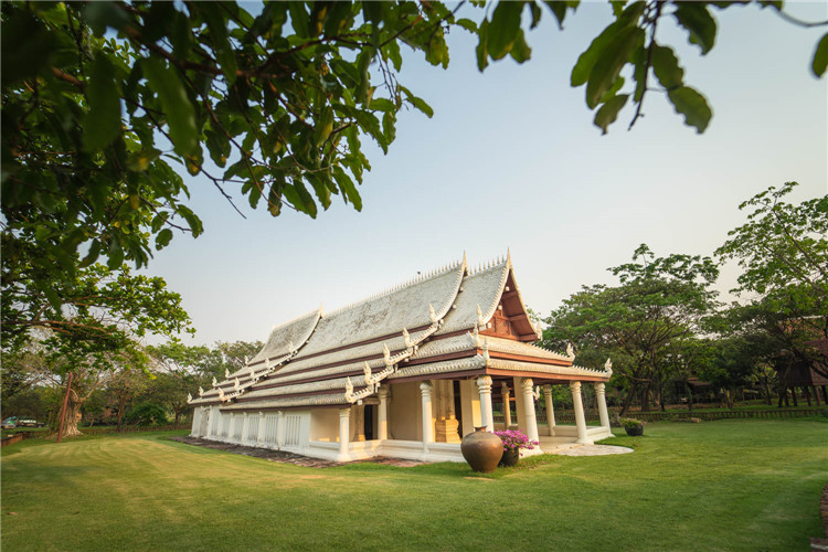 您现在看到的暹罗古城的素可泰宝殿呢,是根据考古和历史证据所重建的; 这座宝殿按照泰国彭世洛府马哈寺的风格建造。然而,自素可泰时期以来,马哈寺已经经历了多次的修复,致使原寺和设计大多失传。因此,暹罗古城团队在深思熟虑后,决定选择素可泰府的楠帕亚寺作为研究的标本,根据素可泰时期的建筑特点制定我们这个素可泰宝殿的复兴计划。宝殿的外部和内部的装饰品都来自清莱府,陶瓷屋顶的装饰是从是塞差那萊县和其它地方发现的原始碎片复制而成的。