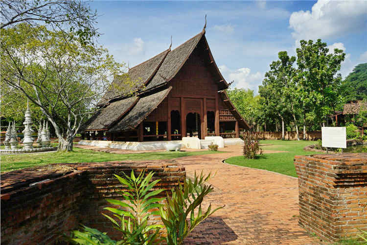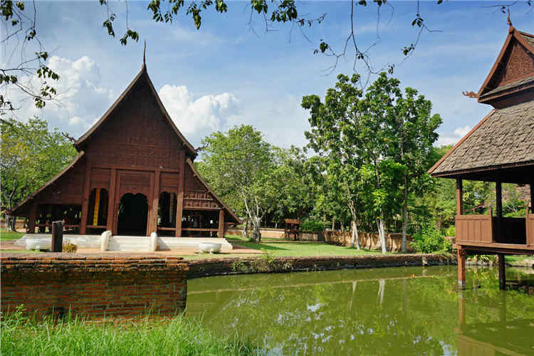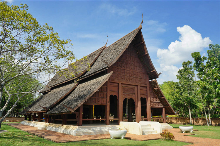 在您眼前的清莱清孔寺宝殿位于清孔县,是在当地拆卸之后运回古城重新组装起来的一座全木制的泰式寺庙,是素可泰和兰纳王国时期重要的寺庙。您看到的这个较大的殿堂是一个公共场所,市民一般在这里参拜佛像和进行宗教活动。而较小的殿堂通常供僧侣讲道,有时候也建在池塘中,位于池塘中的小殿堂通常被称为水厅,以水作为边界标记。这座宝殿全部采用木材建造,没有一个钉子,不仅易于建造,而且技巧巧妙,非常具有学习的价值。