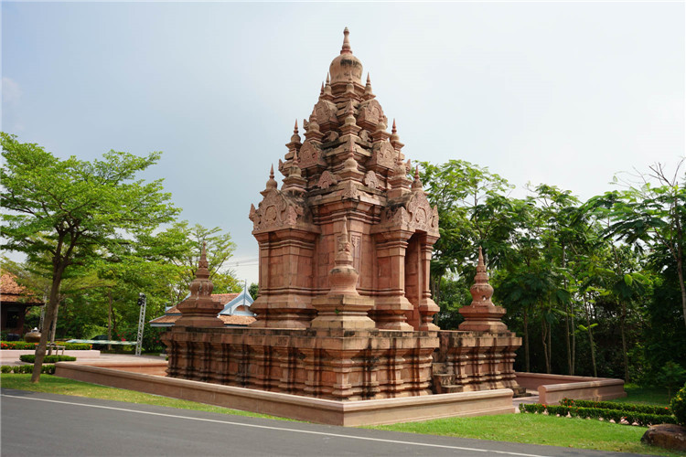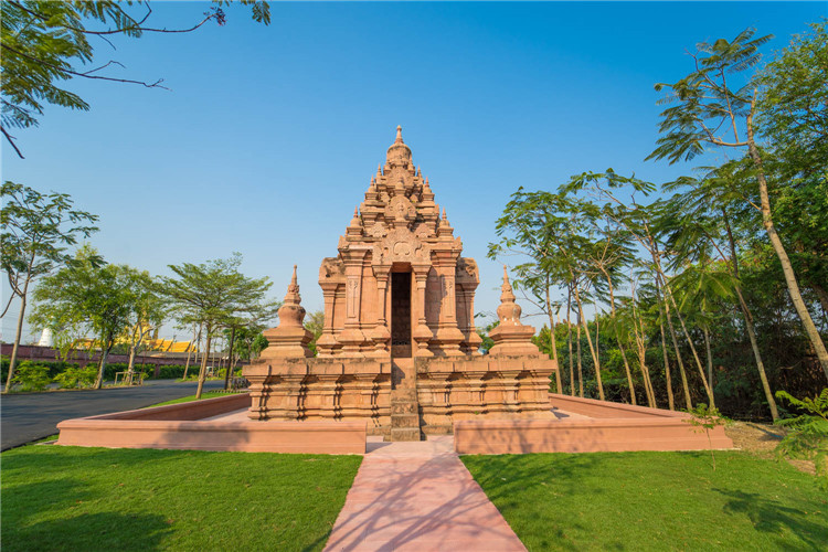 您看到的这座素叻他尼府的猜亚佛塔呢,是泰国南部非常重要的佛塔之一,它的历史比印尼的布什婆罗佛塔还要悠久。佛塔顶部四面都是大乘佛教中的观音雕像,在拉玛5世国王时期这座佛塔曾经大规模的修整过,因此呢,这座佛塔带有曼谷王朝的艺术特征,暹罗古城以它最古老的形态复原了这座佛塔。